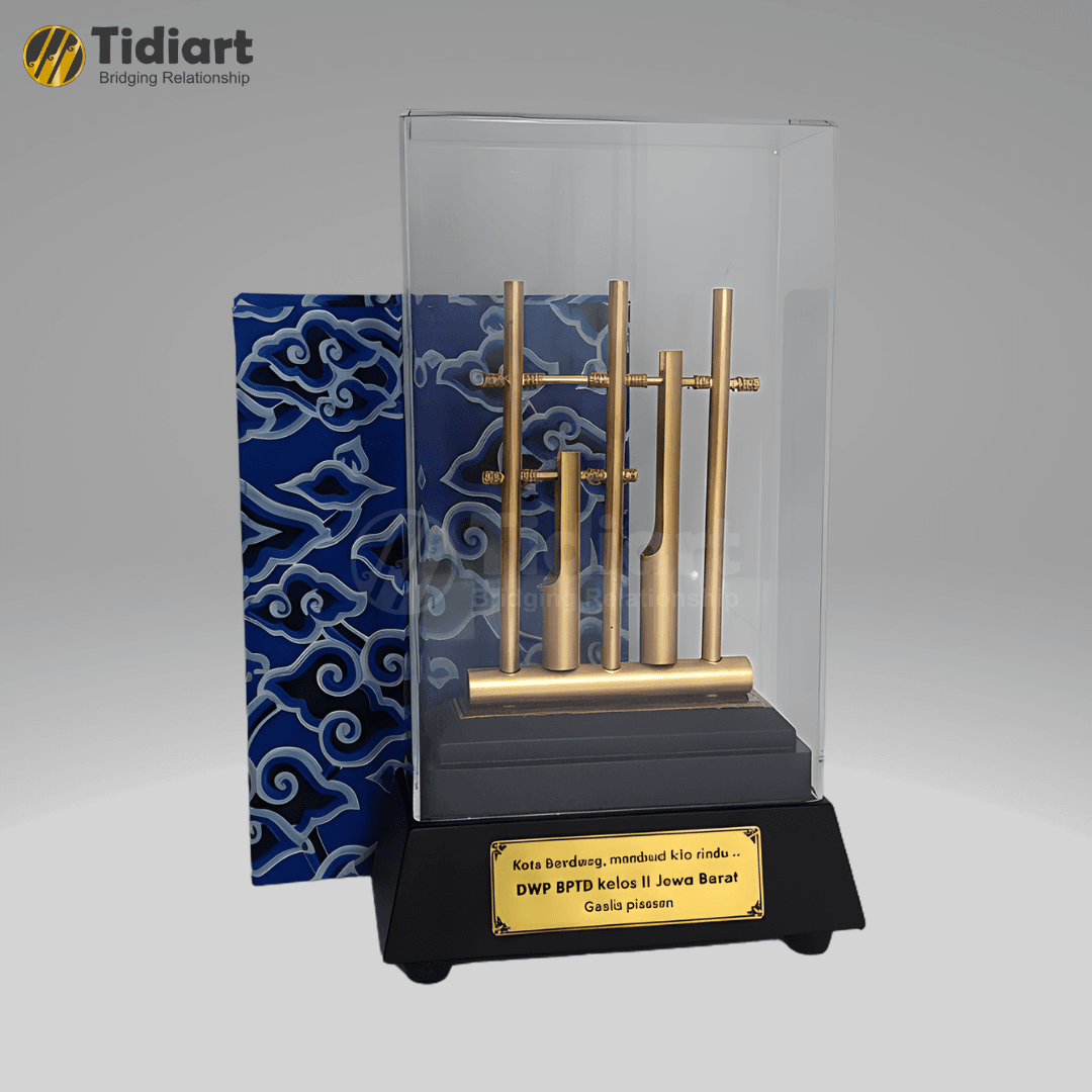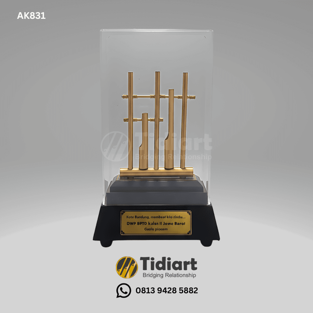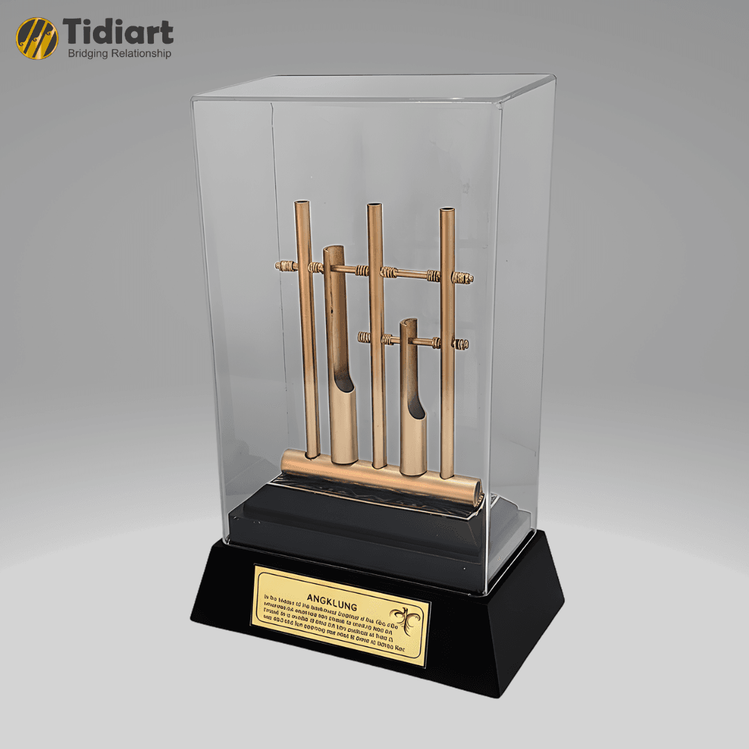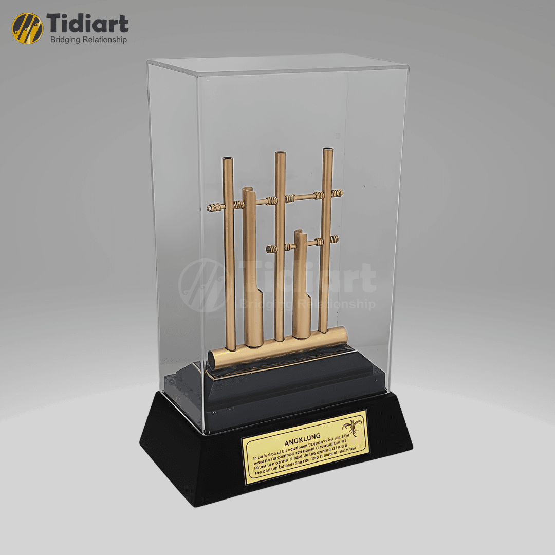 Dibuat menggunakan material logam berkualitas dengan finishing warna emas doff, miniatur ini menampilkan detail angklung yang presisi dan artistik. Produk dilengkapi dengan display akrilik transparan yang melindungi sekaligus memperkuat kesan mewah. Pada bagian dasar terdapat dudukan hitam solid dengan plat kuningan custom yang dapat diukir sesuai kebutuhan acara, instansi, maupun kategori penghargaan.
