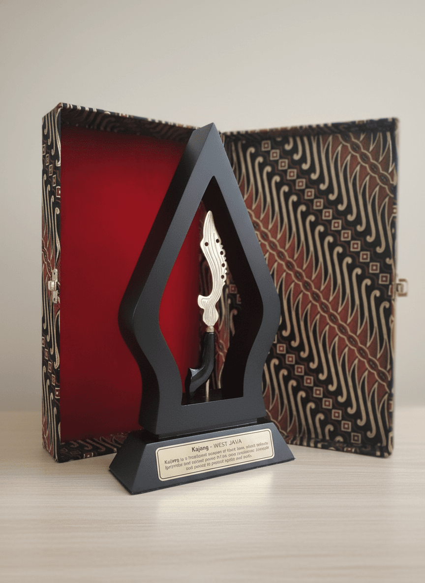 Miniatur Kujang berbahan dasar kuningan dengan serat pamor memiliki keindahan yang unik. Selain itu, frame miniatur tersebut berbentuk Gunungan wayang, yang menambah kesan artistik. Dalam penyusunan stage, digunakan kombinasi kayu Mahogani yang memberikan sentuhan elegan pada keseluruhan karya.
