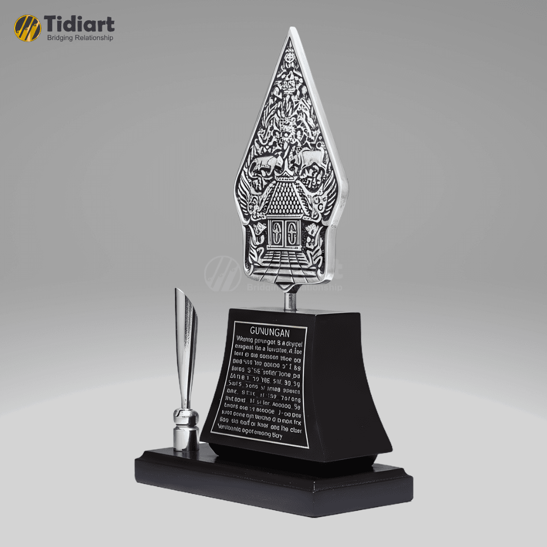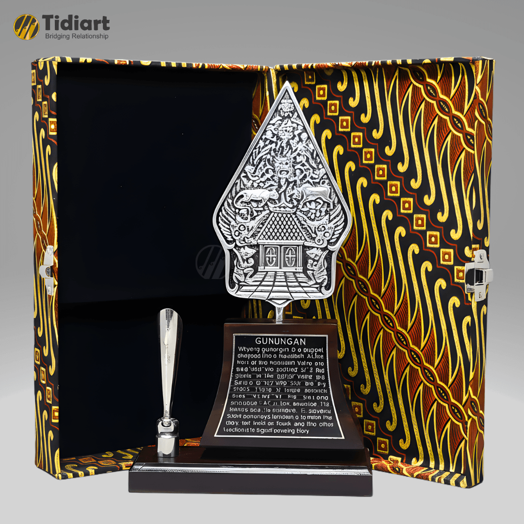 Souvenir Pen Holder Gunungan Wayang Eksklusif merupakan cinderamata premium yang memadukan fungsi dan nilai budaya dalam satu desain elegan. Produk ini terinspirasi dari gunungan wayang, elemen penting dalam pertunjukan wayang kulit yang berasal dari budaya Jawa dan dikenal luas di seluruh Indonesia. Gunungan melambangkan awal dan akhir kehidupan, keseimbangan alam, serta perjalanan manusia. Oleh karena itu, banyak instansi, perusahaan, dan komunitas memilih simbol gunungan sebagai representasi filosofi, kehormatan, serta penghargaan yang bermakna.