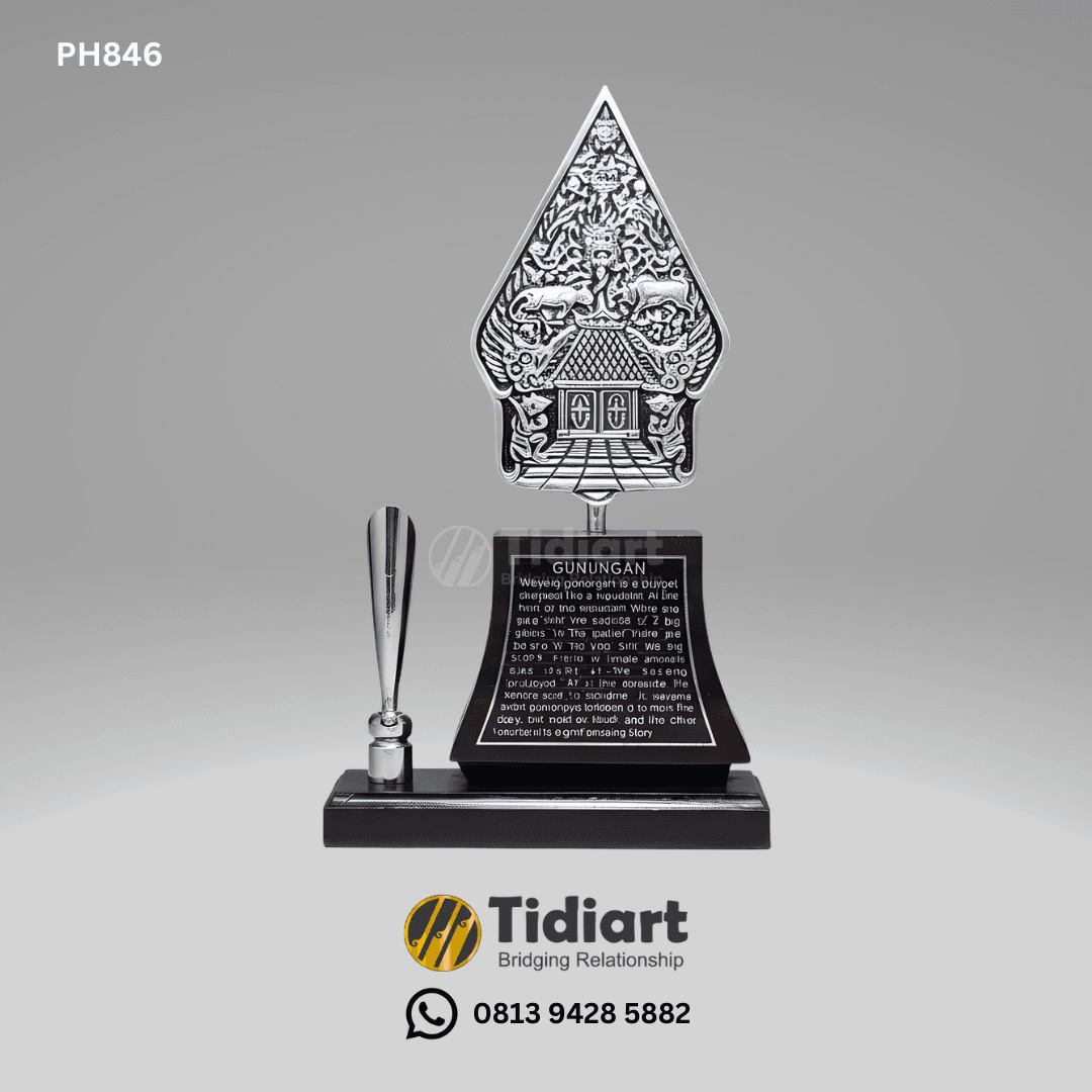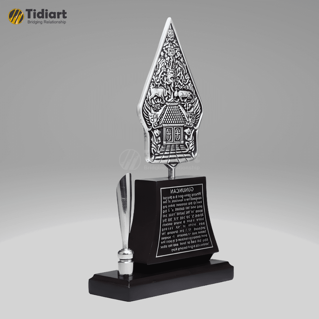 Desain produk memadukan unsur tradisional dan modern secara harmonis. Ukiran gunungan logam tampil detail dan artistik sehingga memperkuat kesan budaya yang berkelas. Sementara itu, dudukan elegan memberikan tampilan profesional dan stabil saat ditempatkan di meja kerja. Selanjutnya, area pen holder menghadirkan fungsi praktis sekaligus estetika dekoratif. Bagian depan juga dilengkapi plat custom yang dapat Anda sesuaikan dengan nama penerima, instansi, atau acara. Dengan demikian, produk ini mampu menghadirkan sentuhan personal sekaligus meningkatkan nilai prestise.